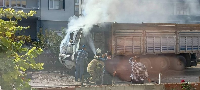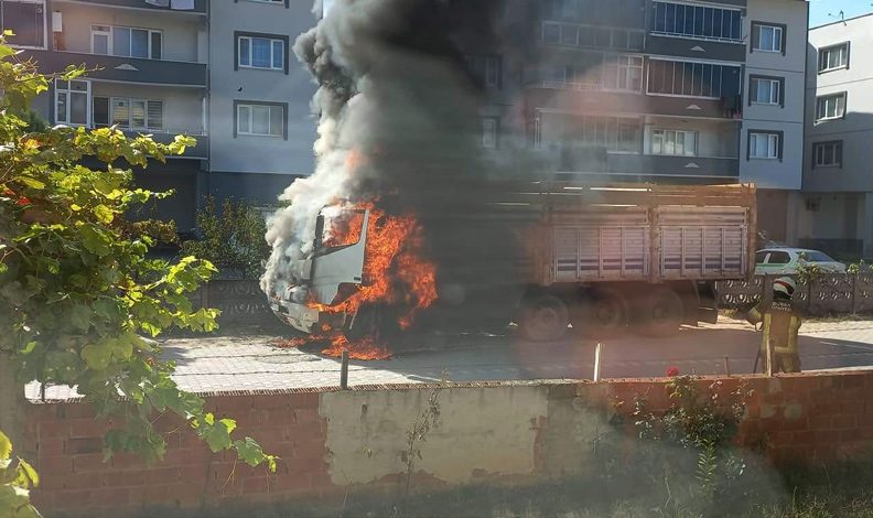 Bursa’nın Nilüfer ilçesi Barış Mahallesinde park halindeki kamyon bilinmeyen sebeple yanmaya başladı.