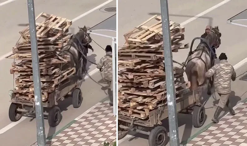 Bursa’nın Karacabey ilçesinde kimliği henüz öğrenilemeyen bir kişi, at arabasına kat kat palet yükledi. Aşırı yük nedeniyle yükün ağırlığı altında güçlükle ilerleyen atın dengesini sağlamakta zorlandığı anlar, çevrede bulunan bir vatandaş tarafından cep telefonu kamerasıyla kaydedildi.