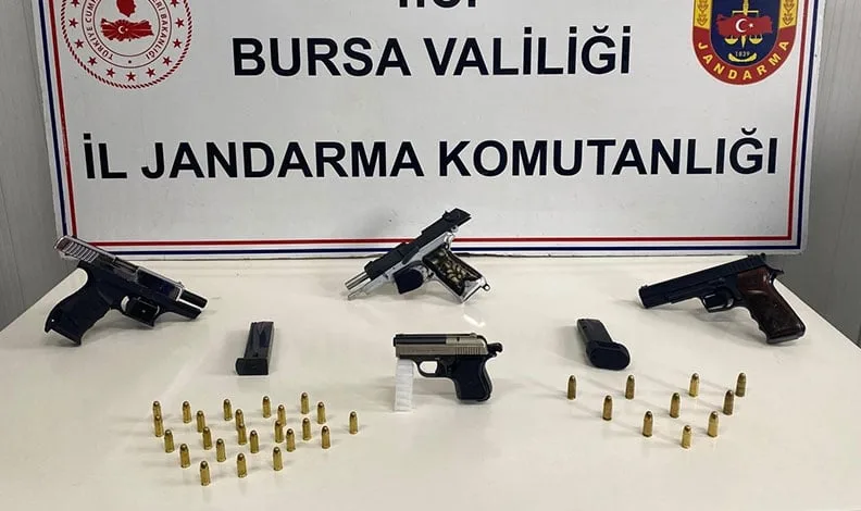 Bursa’nın İnegöl ilçesinde Komutanlık ekipleri tarafından alınan arama kararına istinaden gerçekleştirilen operasyonda, şüpheli şahısların bulunduğu adreste arama yapıldı. Yapılan aramalarda, 1 adet Smith & Wesson marka 9 milimetre ruhsatsız tabanca, 1 adet markasız 9 milimetre ruhsatsız tabanca, 1 adet Lord marka seri numarasız kurusıkı tabanca, 1 adet Blow Mini Mod marka kurusıkı tabanca, 4 adet tabanca şarjörü, 8 adet tabanca fişeği ile 25 adet 7.65 milimetre çapında tabanca fişeği ele geçirildi.