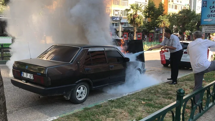 Sürücüsünün ismi öğrenilemeyen 16 TF 673 plakalı araç, Fevzi Çakmak Caddesi üzerinde seyir halindeyken alev aldı.
