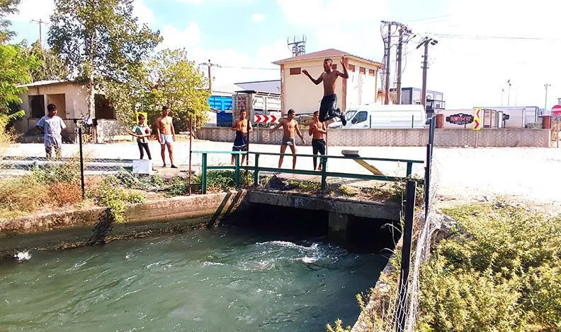 Meteoroloji Genel Müdürlüğü verilerine göre hava sıcaklığının 32 derece olduğu Mustafakemalpaşa’da, hissedilen sıcaklık ise 40 dereceye ulaştı. Sıcak havadan bunalan gençler, Fevzidede Mahallesi’nde vatandaşların tarlaları için kullandıkları sulama kanalına girdi. Tehlikeye aldırış etmeyen gençler, sulama kanalında yüzerek serinledi. Sulama kanalının bulunduğu bölgedeki köprüye de çıkan gençler, derinliği sığ olan sulama kanalına atladı.