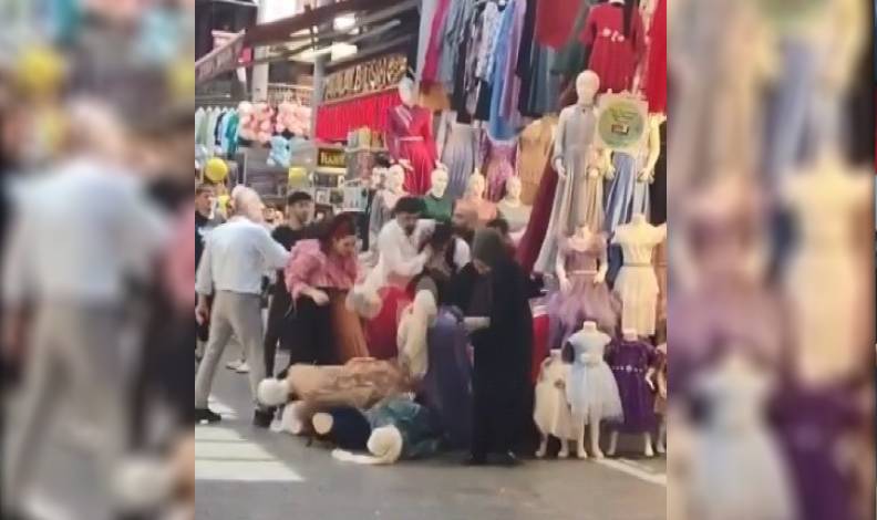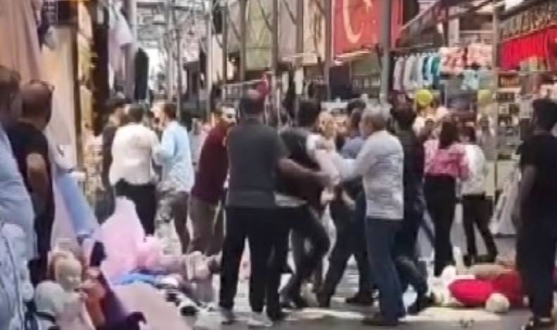 Onlarca kişinin birbirine girdiği tekmeli yumruklu kavga çarşıda bulunan vatandaşlar tarafından saniye saniye görüntülendi. Kavgada dükkanların önünde bulunan cansız mankenlerde devrilip çevreye savruldu.