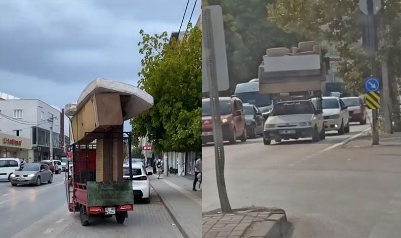 Bir diğer tehlikeli görüntü ise merkez Osmangazi ilçesinden geldi. Bir sürücü, pikap aracın üstüne yatak ve koltuk takımı yükleyerek seyretti. Tehlikeli anlar, trafikteki diğer sürücülerin cep telefonu kamerasına yansıdı.