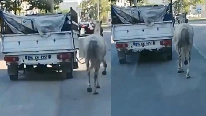 Sürücüsü öğrenilemeyen bir kamyonetin arkasına bir at boynundan iple bağlandı. Cadde üzerinde atın bağlı olduğu hareket halindeki kamyonetin arkasından koştuğu anlar, bir başka sürücü tarafından cep telefonu kamerasıyla kaydedildi.