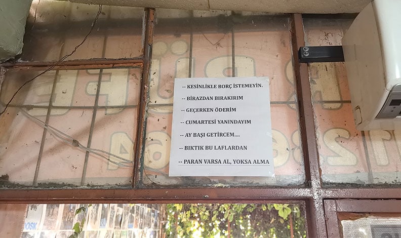 “Ayağınıza sigara istemeyin! Girin içeriden alın. Cumartesi günleri borcunu ödemeyenin hesabı kesilir. Kesinlikle veresiye istemeyin. Birazdan bırakırım, geçerken öderim, cumartesi yanındayım, aybaşı getireceğim, bıktık bu laflardan paran varsa al, yoksa alma.”