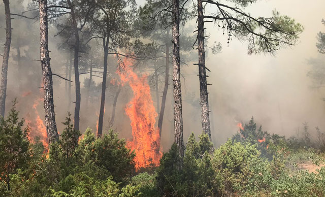 Hemen harekete geçerek kısa sürede olay yerine ulaşan ekipler, yangına karadan müdahale etmeye başladı. Bölgeden yüksek gerilimli elektrik hatlarının geçmesi sebebiyle havadan müdahale yapılamıyor…