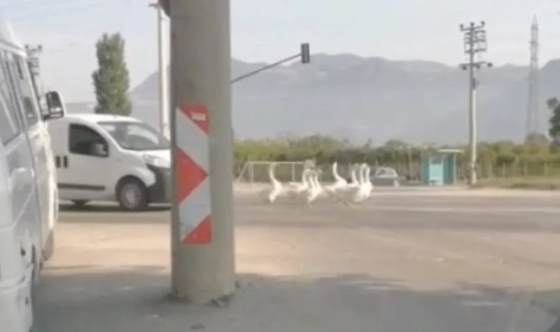 Yola aniden çıkan kazlar nedeniyle trafik durma noktasına geldi. Çevredeki vatandaşlar tarafından kazlar kovalanarak şehirlerarası yol tekrar normal seyrine döndü.