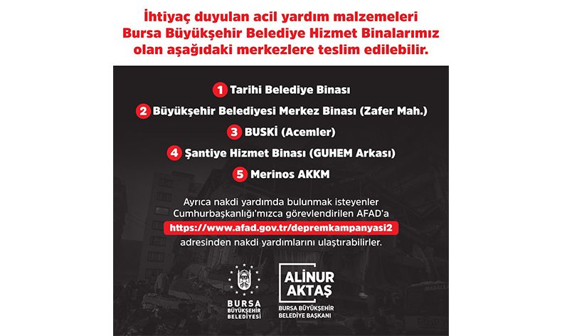 Bu arada Büyükşehir Belediyesi tarafından ‘Sımsıkı sarılacağız, yaralarımızı saracağız’ sloganıyla başlatılan yardım kampanyasında, bölgenin acil ihtiyaç listesi yayınlandı. Depremzedelere yardım etmek isteyen vatandaşlar; hazır gıda, konserve, çocuk maması, su, ısıtıcı, battaniye, yatak – yorgan, çocuk bezi, ıslak mendil, diş macunu, diş fırçası, sabun, kadın pedi, tuvalet kağıdı ve peçete gibi hijyen malzemeleri ile iç çamaşırı, çorap ve termal giysi yardımında bulunabilecek. Kullanılmamış, sıfır malzemeler yardım olarak kabul edilirken; yardımlar tarihi belediye binası, Büyükşehir Belediyesi merkez binası, BUSKİ, GUHEM arkasındaki şantiye hizmet binası ve Merinos AKKM’den toplanacak. Nakdi yardımda bulunmak isteyen vatandaşlar, www.afad.gov.tr/depremkampanyasi2 adresi üzerinden yardımda bulunabilecekler.
