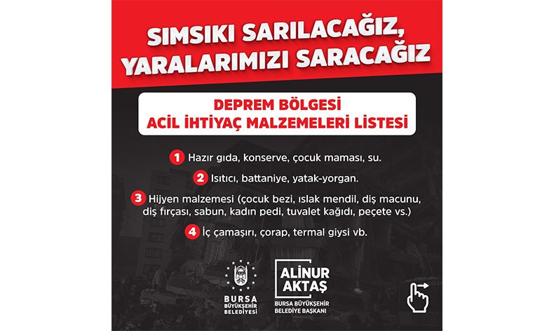Bu arada Büyükşehir Belediyesi tarafından ‘Sımsıkı sarılacağız, yaralarımızı saracağız’ sloganıyla başlatılan yardım kampanyasında, bölgenin acil ihtiyaç listesi yayınlandı. Depremzedelere yardım etmek isteyen vatandaşlar; hazır gıda, konserve, çocuk maması, su, ısıtıcı, battaniye, yatak – yorgan, çocuk bezi, ıslak mendil, diş macunu, diş fırçası, sabun, kadın pedi, tuvalet kağıdı ve peçete gibi hijyen malzemeleri ile iç çamaşırı, çorap ve termal giysi yardımında bulunabilecek. Kullanılmamış, sıfır malzemeler yardım olarak kabul edilirken; yardımlar tarihi belediye binası, Büyükşehir Belediyesi merkez binası, BUSKİ, GUHEM arkasındaki şantiye hizmet binası ve Merinos AKKM’den toplanacak. Nakdi yardımda bulunmak isteyen vatandaşlar, www.afad.gov.tr/depremkampanyasi2 adresi üzerinden yardımda bulunabilecekler.