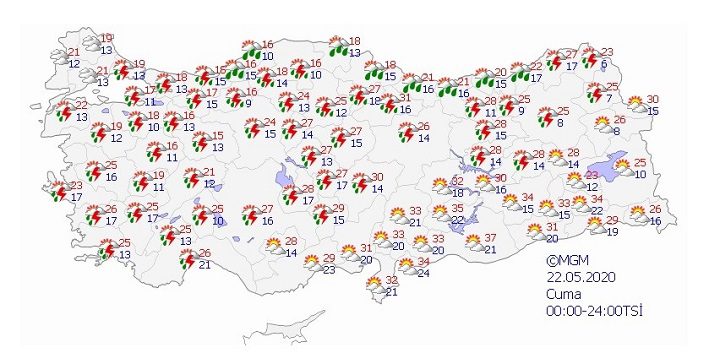 Meteoroloji Genel Müdürlüğünden yapılan yazılı açıklamada, yurdu bir haftadır etkisi altına alan Afrika sıcaklıkları sabah saatlerinden itibaren yerini 10-15 derece azaltarak serin ve yağışlı bir havaya bırakacağı belirtildi. Açıklamanın devamında ise, ”Sıcak hava dalgası nedeniyle yurdumuzun özellikle güney ve batı bölgelerinde hava sıcaklığı mevsim normallerinin 10 ile 13 derece üzerinde seyretmiş ve uzun yıllar Mayıs ayı en yüksek sıcaklık rekorları kırılmıştır. Sıcaklık rekoru kıran illerimiz ve ölçülen sıcaklıkları ise Bursa 38.0, Eskişehir 35.3, Konya 35.0, Muğla 39.4, Manisa 40.6, Aydın 42.6, Denizli 39.1, Uşak 34.5, Afyonkarahisar 33.9, Isparta ve Burdur 35.4 ve Antalya’da 43.0 derece olarak kaydedilmiştir. Balkanlar üzerinden gelecek serin ve yağışlı sistemin; Marmara Bölgesi, Batı Karadeniz, İç Ege, İç Anadolu’nun kuzeybatısı ile Orta Karadeniz’in iç kesimlerinde yerel olarak gök gürültülü sağanak yağışlara neden olması beklenmektedir.