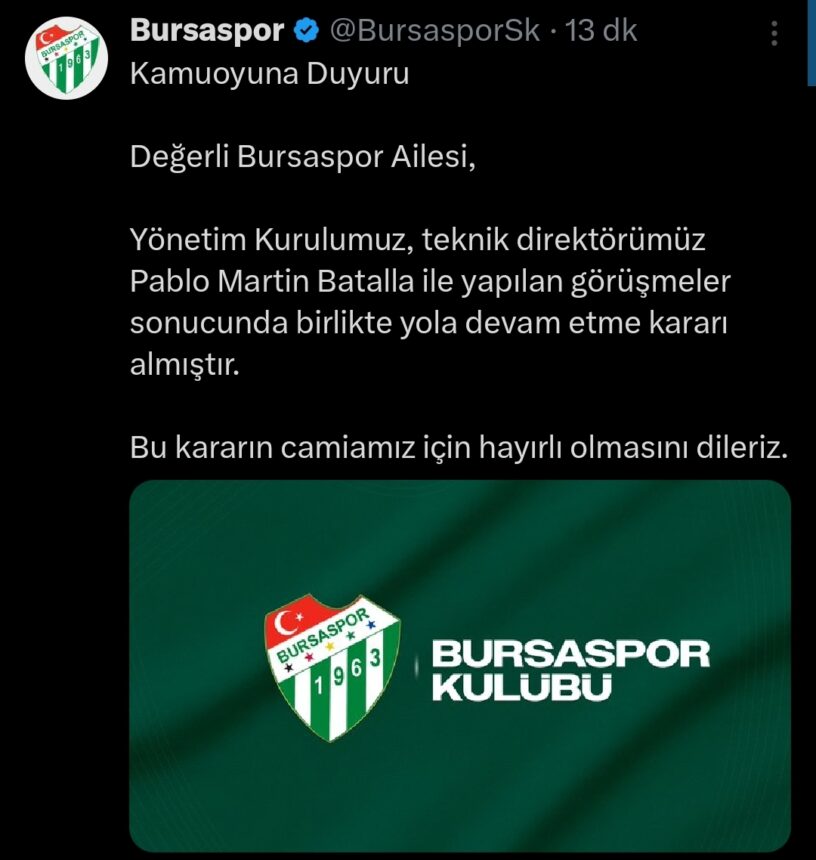 Kulüpten yapılan açıklalamada Pablo Martin Batalla ile yola devam edileceği açıklandı.
