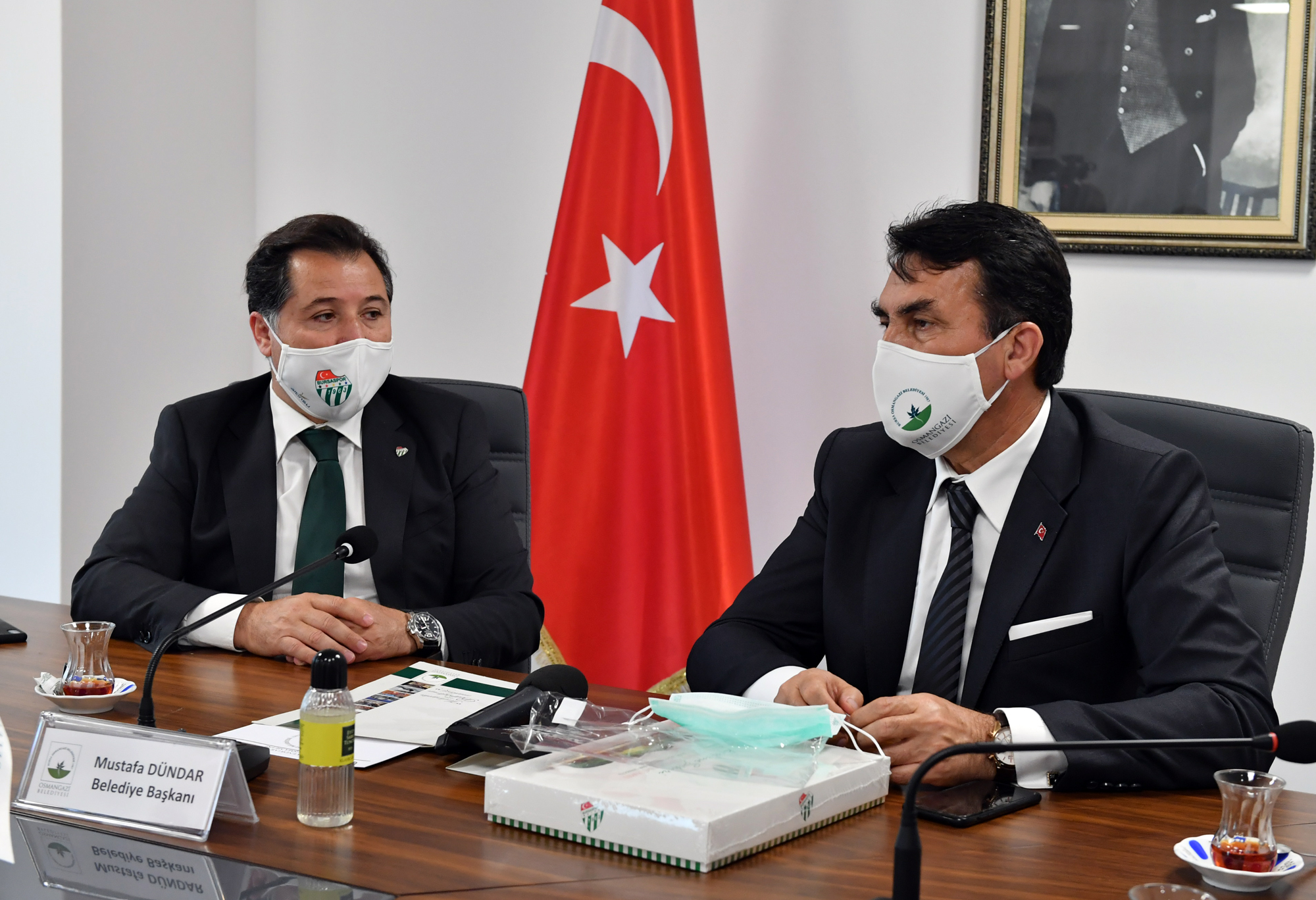 Mestan, ziyaret sonunda Başkan Mustafa Dündar’a Osmangazi Belediyesi logolu maske hediye etti.