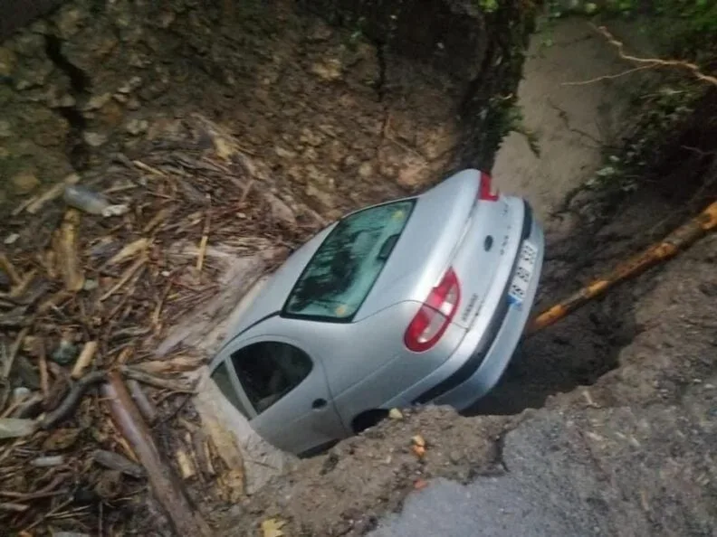 Bartın’da etkili olan sağanak yağış sonrası çöken yola düşen iki araçtaki 12 kişi araçların camlarından çıkarak kurtuldu.