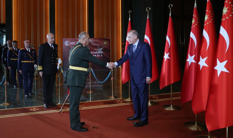 Törende, ayrıca Cumhurbaşkanlığı Muhafız Alayı Bandosu marşlar seslendirdi. Tören, başkentte görevli çeşitli rütbelerden askeri personelin Cumhurbaşkanı Erdoğan’a tebriklerini sunmasıyla sona erdi.