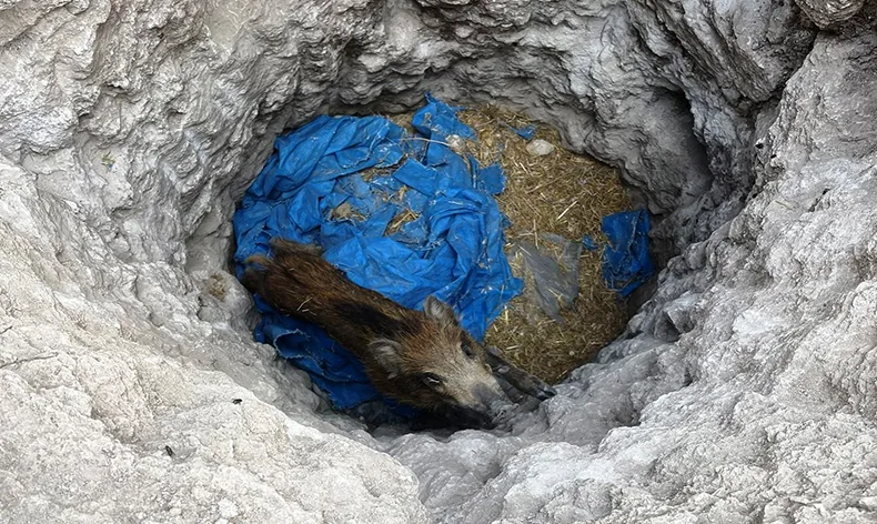 Altıntaş Orman İşletme Müdürlüğü Kızıldağ Orman İşletme Şefliği muhafaza memurları arazide define avcılarının açmış olduğu çukura düşen domuz yavrusunu boynuna ip geçirip kuyudan çıkararak tekrar doğaya saldılar.