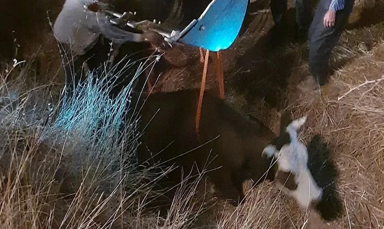 Ekipler, kepçe yardımıyla bulunduğu yerden ineği çıkarıp yapılan tetkikler sonrası sahibine teslim etti.