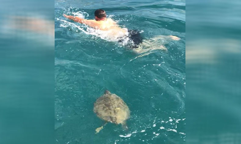 İlginç olay, Alanya Tersanesi açıklarında meydana geldi. Amatör balıkçılık yapan Mehmet Ali Tayyar ve arkadaşı Recep Türkmen, kendi tekneleriyle tersane önüne demirleyerek dalış yapmak istedi. Aynı zamanda pervanelerine takılan oltayı da temizlemek isteyen ikili dalışa başladıktan 15-20 dakika sonra, sol yüzgeci olmayan yaklaşık 80 santimetre boyunda carretta caretta onlara yaklaştı. İlk başta korkarak tekneye çıkan ikili, daha sonra yaklaşık 1,5 saat boyunca kaplumbağa ile birlikte yüzdü. İkilinin o anları ise cep telefonu kamerasına yansıdı.