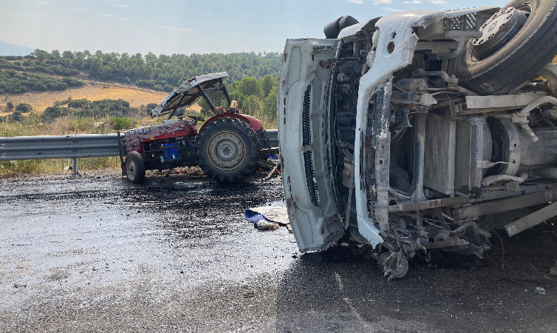Devrilen kamyon traktöre çarptı