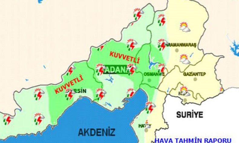 Meteoroloji 6. Bölge Müdürlüğünden yapılan açıklamada, bugün öğle saatlerinden itibaren Adana’nın kuzey ve doğusunda Yumurtalık, Ceyhan, Sarıçam, Pozantı, Kozan, Karaisalı, İmamoğlu, Çukurova ve Aladağ ilçeleri ile Mersin’in kuzeyinde Mut, Silifke, Erdemli, Mezitli, Toroslar, Çamlıyayla ve Tarsus ilçeleri, Osmaniye ve Hatay’ın kuzey ilçeleri Dörtyol, Payas, İskenderun ve Erzin ile Kahramanmaraş’ın Andırın ilçesinde yerel olarak kuvvetli gök gürültülü sağanak yağış beklendiğin ifade edildi.