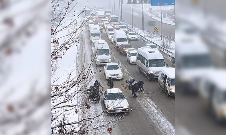 Eskişehir’de sabah erken saatlerden itibaren etkili olan yoğun kar yağışı bazı bölgelerde hayatı adeta felç etti. Çevre yollarında da etkili olan yoğun kar yağışı, trafikte sıkışıklıklara neden oldu. Eskişehir-Ankara kara yolu Matbaacılar Sitesi mevkiinde simit sattığı motosikletiyle yoğun kar yağışına rağmen ilerlemeye çalışan yaşlı bir amca, kayganlaşan yolda dengesini kaybederek düştü. Motosikletinde bulunan simitler ise yola saçıldı. Çevre yolunda seyir halinde bulunan ve durumu fark eden sürücüler ise adeta yolu trafiğe kapatarak simitlerini toplamaya çalışan amcaya yardım etti.