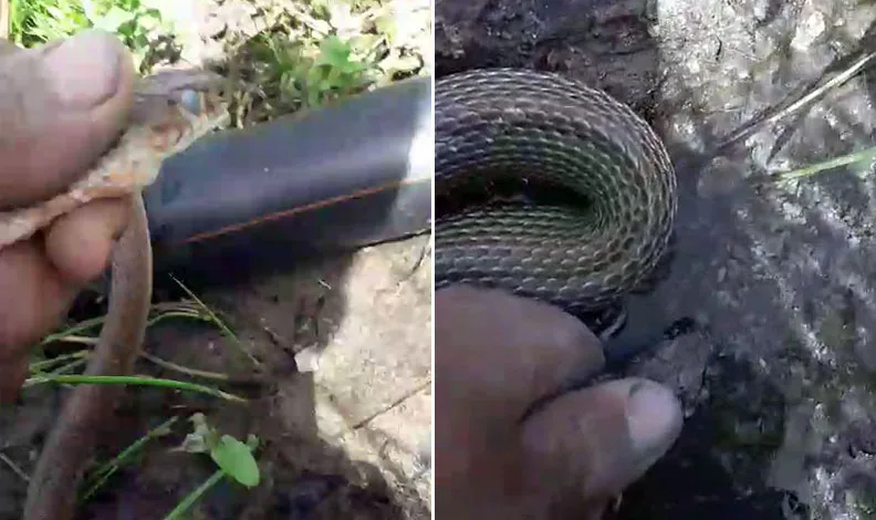 Eliyle tuttuğu yılana su içirdi