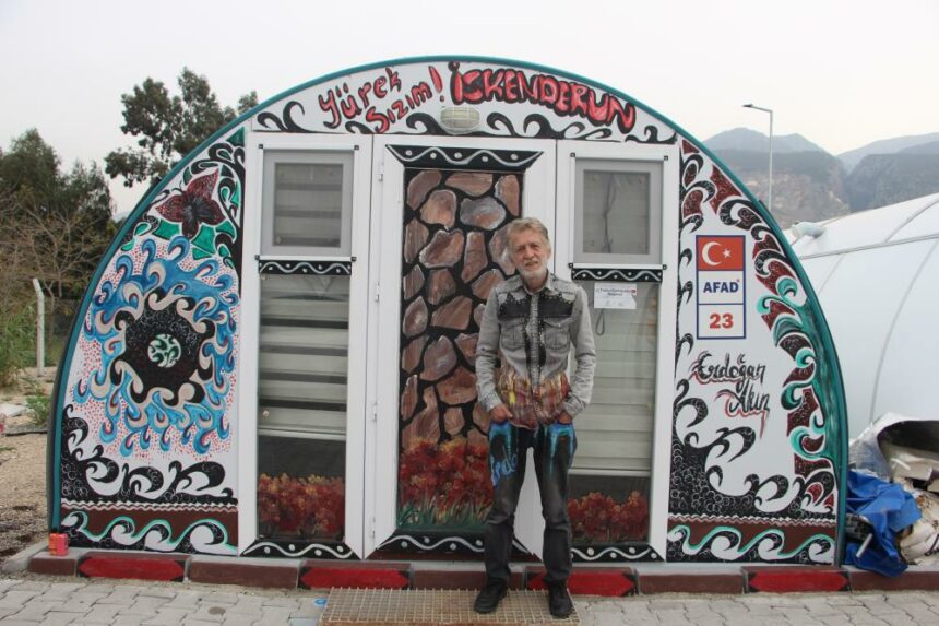 Kahramanmaraş merkezli depremlerde Hatay’da binlerce bina hasar görmüş ve 200 bine yakın insan konteyner kentlerde yaşamaya başlamıştı. İskenderun ilçesinde yaşayan 60 yaşındaki amatör ressam Erdoğan Akın, hevesle çıktığı yolda hiçbir ücret almadan konteynerleri boyuyor. Renklenen konteynerler çocukların yüzünü güldürürken bu durumdan en çok amatör ressam mutlu oluyor. Geride kalan süreçte 50’ye yakın konteyneri boyayan Akın’ın hedefi kentteki tüm konteynerlerin renklendirilmesi. Akın’ın enkazdan çıkan bir vatandaşın elinden esinlenerek ortaya koyduğu el heykeliyse görünümüyle dikkat çekiyor.