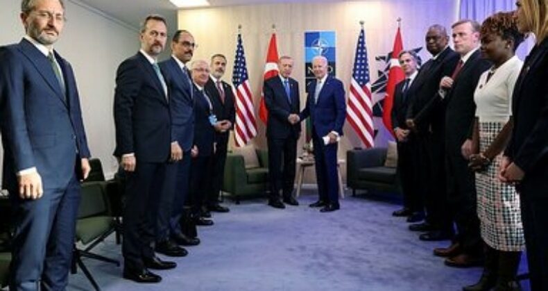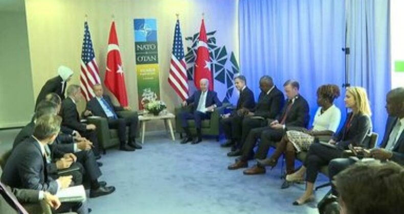 Erdoğan’ın, Biden ile görüşmesinde, Dışişleri Bakanı Hakan Fidan, Milli Savunma Bakanı Yaşar Güler, MİT Başkanı İbrahim Kalın, Cumhurbaşkanı İletişim Başkanı Fahrettin Altun, Savunma Sanayii Başkanı Haluk Görgün ile Cumhurbaşkanlığı Başdanışmanı Büyükelçi Akif Çağatay Kılıç da yer aldı.
