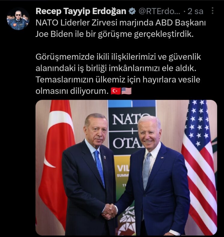 Başkan Erdoğan, “NATO Liderler Zirvesi marjında ABD Başkanı Joe Biden ile bir görüşme gerçekleştirdik. Görüşmemizde ikili ilişkilerimizi ve güvenlik alanındaki iş birliği imkânlarımızı ele aldık. Temaslarımızın ülkemiz için hayırlara vesile olmasını diliyorum.” ifadelerini kullandı.