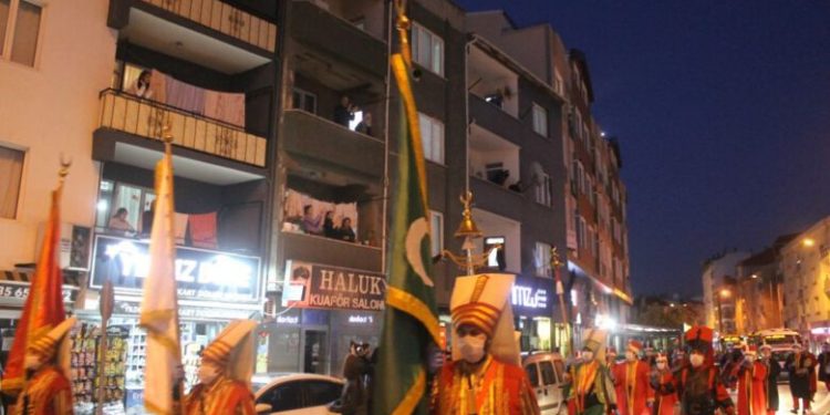 Salgından korunma tedbirlerine dikkat ederek, maske ve eldivenleriyle, sosyal mesafelerini koruyarak, Atatürk Caddesi boyunca gösteri sunan Ay Yıldız Mehteran Takımı’nın gösterisi Şehit Cüneyt Yıldız Caddesi’nde son buldu.