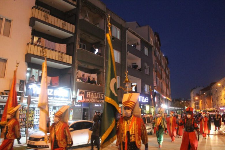 Salgından korunma tedbirlerine dikkat ederek, maske ve eldivenleriyle, sosyal mesafelerini koruyarak, Atatürk Caddesi boyunca gösteri sunan Ay Yıldız Mehteran Takımı’nın gösterisi Şehit Cüneyt Yıldız Caddesi’nde son buldu.