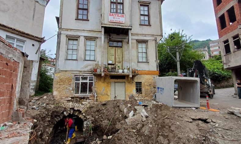 Altınordu’nun Aziziye Mahallesi çalışma yapan Ordu Büyükşehir Belediyesi ekipleri, su baskınlarına sebep olan derelerde temizlik çalışmalarını sürdürüyor. Su taşkınına sebep olan alanlarda yapılan çalışmalar sırasında tarihi bir evin altında taş işçiliği ile ıslah duvarı bulunan kemerli yapı şeklinde 4 metrelik dere yatağı ortaya çıktı.