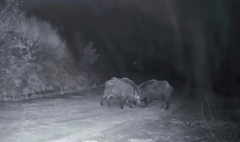 Tekirdağ’ın Süleymanpaşa ilçesi sınırlarında bulunan Ganos Dağları’nda doğaya yerleştirilen fotokapan kameraları dikkat çeken görüntüler kaydetti. Kameraya yansıyan görüntülerde 4 yaban domuzunun bulunduğu alanda, iki domuzun kameranın bir tarafında, diğer iki domuzun ise farklı bir noktasında kavga ettiği görüldü. Görüntülerde domuzların birbirlerine saldırarak uzun süre mücadele ettiği, iki ayrı noktada yaşanan kavgaların aynı anda devam ettiği dikkat çekti. Ormanlık alanda yaşanan bu sıra dışı anlar fotokapan kamerası tarafından saniye saniye kaydedildi.