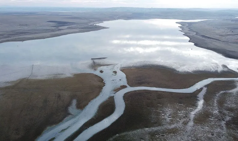 Ocak 2025’te kaydedilen ilk görüntülerde, su seviyesi geçtiğimiz yıllara oranla düşük olsa da, barajı besleyen ırmak kollarının hala akmaya devam ettiği görülüyor. Kış mevsiminin etkisiyle baraj çevresi büyük oranda suyla kaplı, doğal yaşamın izleri ise halen hissediliyordu.