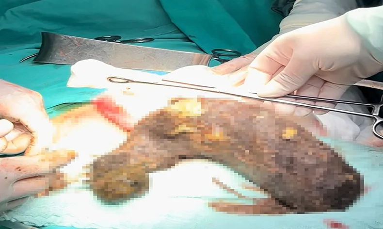 Genel Cerrah Dr. Süleyman Belli, ameliyatın başarılı geçtiğini belirterek, “Bu hastamız 20 yaşında genç kız, şiddetli karın ağrısı şikayetiyle bizim acilimize başvurdu. Yapılan tetkikler ve görüntüleme sonuçlarında midede bir yabancı cisim gördük. Aynı zamanda batında sıvı olduğu gözlendi. Biz de bu durum üzerine hemen acil ameliyat kararı aldık, ameliyata aldığımızda batında yaklaşık 1 santimlik bir yırtık tespit ettik, bu yırtık saç yumağına bağlı olmuş. Bu yırtık içinden mideyi muayene ettiğimizde mideyi tam dolduran 12 parmak bağırsağı da dolduran yaklaşık 50 santim boyutunda 1 buçuk 2 kilo ağırlığında bir saç yumağı ve mide şeklini almış saç yumağı kitlesini çıkardık. Midenin içindeki kılları ve geri kalan artıkların hepsini temizledik” dedi.