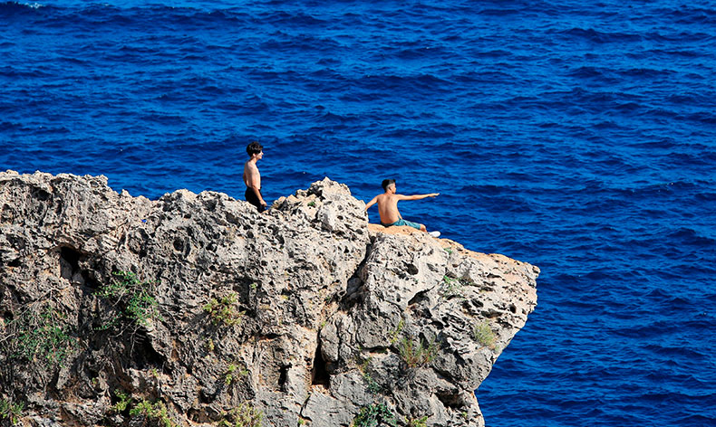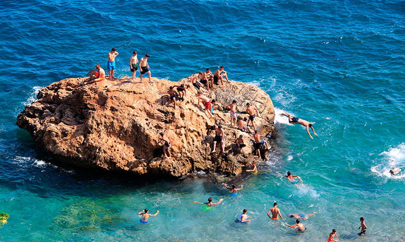 Tatili fırsat bilerek Konyaaltı sahiline gelen gençler ise yaklaşık 40 metrelik falezlerin üzerinden manzaranın keyfini çıkardı. Falezlerin en uç noktasında gençlerin Antalya manzarasına karşı keyfi sahilde denize giren ve güneşlenen vatandaşların yüreklerini ağzına getirdi.
