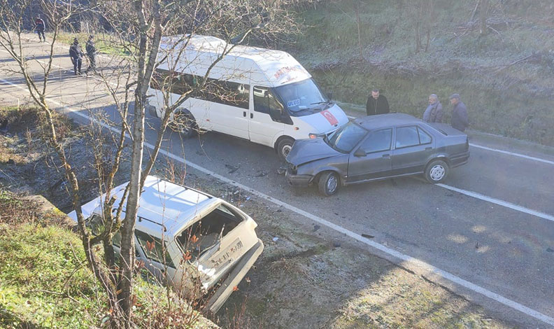 Edinilen bilgiye göre, Ulus ilçesinden Abdipaşa Beldesi istikametine seyir halinde olan Nimet Şahin idaresindeki 74 M 2138 plakalı minibüs ile önündeki Mustafa Şahin yönetimindeki 74 AT 174 plakalı otomobile karşı yönden gelen Hüseyin Yılmaz idaresindeki 74 BP 573 plakalı Fiat Tofaş marka araç çarptı.
