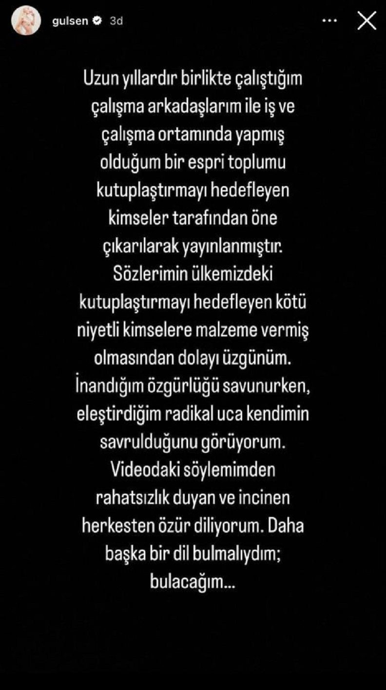 “Uzun yıllardır birlikte çalıştığım çalışma arkadaşlarım ile iş ve çalışma ortamında yapmış olduğum bir espri toplumu kutuplaştırmayı hedefleyen kimseler tarafından öne çıkarılarak yayınlanmıştır. Sözlerimin ülkemizdeki kutuplaştırmayı hedefleyen kötü niyetli kimselere malzeme vermiş olmasından dolayı üzgünüm. İnandığım özgürlüğü savunurken, eleştirdiğim radikal uca kendimin savrulduğunu görüyorum. Videodaki söylemimden rahatsızlık duyan ve incinen herkesten özür diliyorum. Daha başka bir dil bulmalıydım; bulacağım.”