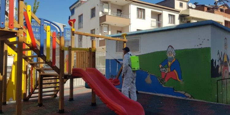 Belediyesi Park ve Bahçeler Birimi tarafından yapılan dezenfekte çalışmaları çerçevesinde parklardaki çocuk oyun grupları, banklar, spor aletleri, tabelalar ilâçlanıyor.