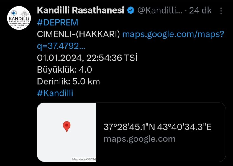 AFAD’tan alınan bilgiye göre, Hakkari’de 4.0 büyüklüğünde depremmeydana geldi.