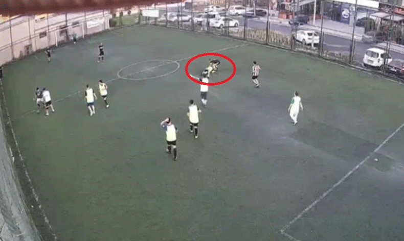 Maçın başlamasıyla koşmaya başlayan genç birden yere yığıldı. Arkadaşları ise hemen yanına koşarak durumu anlamaya çalıştı.
