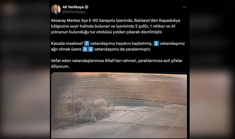 Sosyal medya hesabından kaza anına ait kamera kaydı görüntüsünün paylaşan Bakan Yerlikaya, paylaşımında, “Aksaray Merkez ilçe E-90 karayolu üzerinde, Balıkesir’den Kapadokya bölgesine seyir halinde bulunan ve içerisinde 2 şoför, 1 rehber ve 41 yolcunun bulunduğu tur otobüsü yoldan çıkarak devrilmiştir. Kazada maalesef 7 vatandaşımız hayatını kaybetmiş, 2 vatandaşımız ağır olmak üzere 33 vatandaşımız da yaralanmıştır. Vefat eden vatandaşlarımıza Allah’tan rahmet, yaralılarımıza acil şifalar diliyorum” ifadeleri yer aldı.