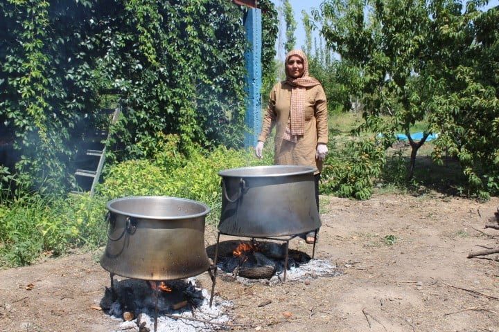 Iğdırlı bir grup ev kadını, bahçelerde topladıkları şeftaliyi kurdukları kazanlarda kaynatarak reçel yapıyor.