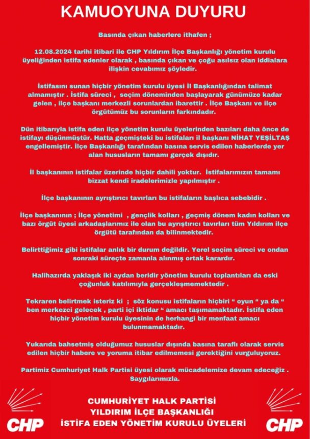 Cumhuriyet Halk Partisi Yıldırım İlçe Yönetim Kurulu Üyeleri, ilçe başkanının tutum ve davranışlarını gerekçe göstererek istifa etti.