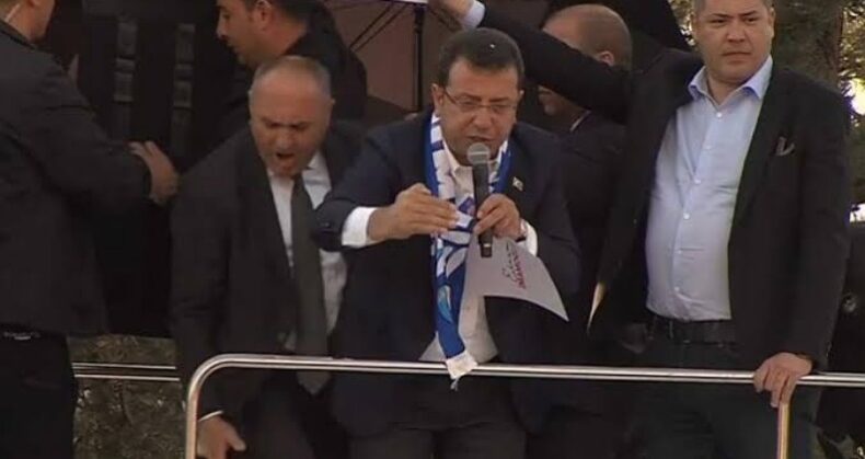 Millet İttifakı’nın Cumhurbaşkanı yardımcısı adayı ve İstanbul Büyükşehir Belediye Başkanı Ekrem İmamoğlu’na mitingi sırasında bir grup taş attı. İmamoğlu konuşmasında kitleye sakin olmaları çağrısında bulundu.