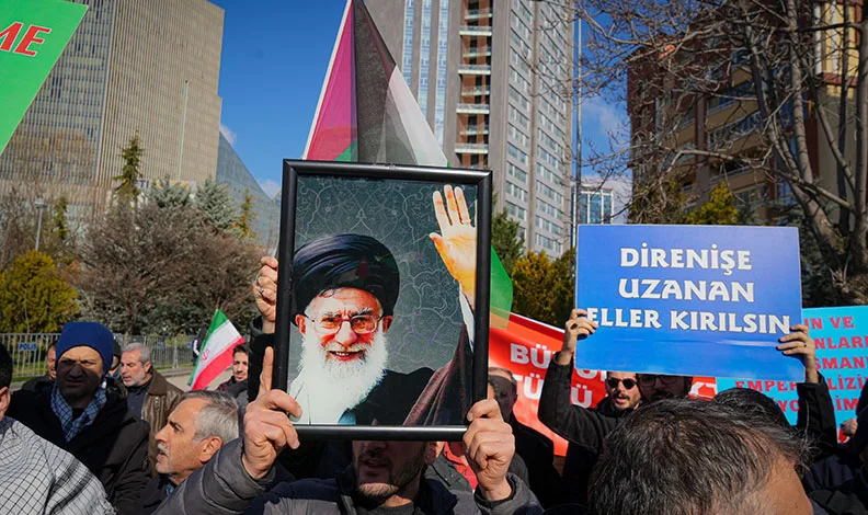 ABD’nin Ankara Büyükelçiliği önünde, İran bayrakları, Hamaney’in fotoğrafları ve “İslam’ın ve Müslümanların asıl düşmanı emperyalizm ve siyonizmdir”, “Amerika’nın özgürlük ve demokrasisi katliamdır” yazılı dövizler taşıyan kalabalık, “Kahrolsun ABD” ve “Kahrolsun İsrail” sloganları attı.