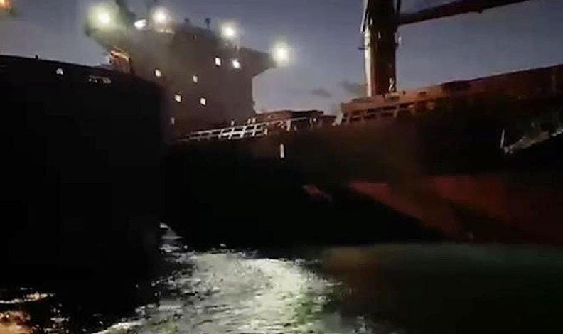 Botla gemiye erzak yükleyen çalışanlar sürüklenen gemiyi görünce neye uğradıklarını şaşırırken, iki geminin arasında kalmaktan son anda kurtuldu.