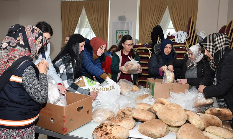 İznik’te yapılan Ekmek yardımı çağrısıyla kadınlar evlerinde, fırıncılar iş yerlerinde seferber oldular. Geceden yoğrulan ekmek hamurları sabahın erken saatlerinde fırınlardan çıkartılarak belediyeye getirildi. Gerek ilçe merkezinden gerek köylerden gelen köy ekmekleri paketlenerek kolilendi.