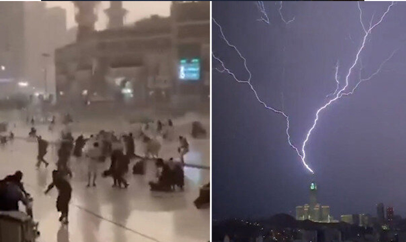 Mekke kentini şiddetli yağış ve fırtına vurdu. Kabe’de ibadet eden çoğu Müslüman, olumsuz hava koşullarına rağmen ibadetlerine devam etti. Fırtınanın şiddetli ile bazı kişilerin yürümekte zorlandığı görülürken, çok sayıda güvenlik bariyeri ise devrildi.