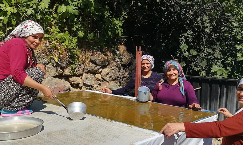 Kadınların zorlu pestil yapımı