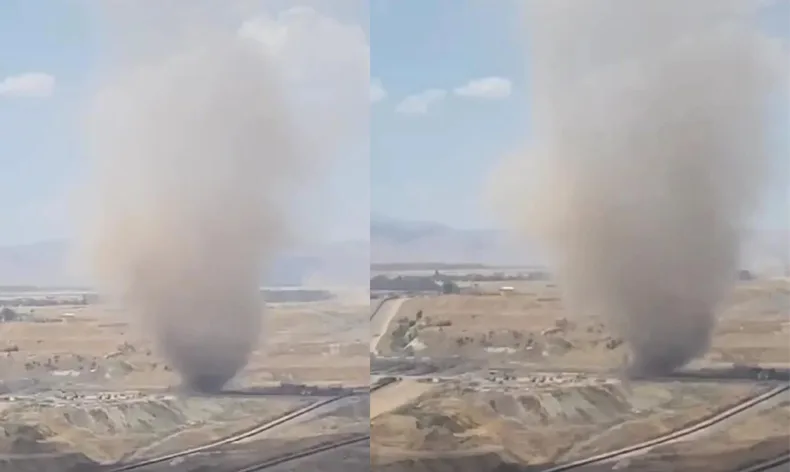 Kahramanmaraş’ın Afşin ilçesindeki kömür sahasında oluşan dev hortum, helikopterden görüntülendi.